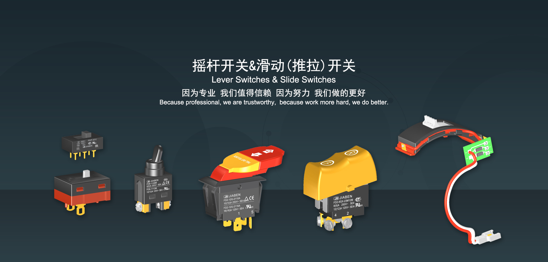 浙江佳奔電子有限公司始建于1986年,坐落于浙江省樂清市虹橋鎮(zhèn)東電子信息產(chǎn)業(yè)園內(nèi),現(xiàn)有職工700多人,資產(chǎn)總額超3億元。公司主要經(jīng)營“JIABEN”牌微動開關(guān)、蹺板開關(guān)、按鈕開關(guān)、扳機(jī)開關(guān)、調(diào)速開關(guān)和電位器開關(guān)等各類交、直流器具開關(guān)和各類交、直流線路板模塊等產(chǎn)品,主要應(yīng)用于交、直流電動工具、電動園林工具、清潔器具、家用電器和小型機(jī)床等行業(yè),是集產(chǎn)品設(shè)計、研發(fā)、制造、銷售和服務(wù)于一體的國家高新技術(shù)企業(yè)。JIABEN was founded in 1986, located in East Electronic Information Industry Park, Hongqiao Town, Yueqing City, Zhejiang Proviance, existing staff more than 700 peoples, more than 300 million RMB worth of assets. Company is mainly engaged in "JIABEN" brand Micro Switch, Rocker Switch, Push-button Switch, Trigger Switch, Speed Regulating Switch, Potentiometer Switch and other kinds of appliance switch and all kinds of AC or DC circuit board module, such as more than 100 series, 8000 kinds of models of products, mainly used in AC or DC Power-tools, Power Gardening Tools, Cleaning Appliances, Household Appliances and Small Machine Tool and other industries, is the collection product design, research and development, manufacturing, sales and service in one of the national high and new technology enterprise.